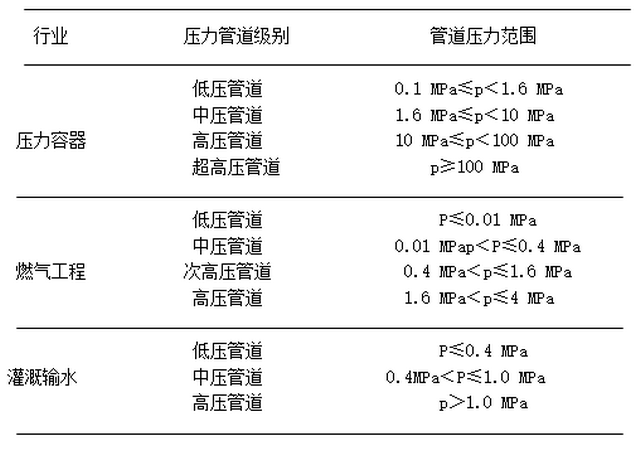 目前,管道的分類主要有兩種方法:按照材質和壓力分類,其中按照材質分類是管道主要的分類方法。管道按照是否加壓分為無壓管道和壓力管道。壓力管道是輸送的液體氣體等介質在加壓的狀態(tài)下運行的管道的統(tǒng)稱,一般以大氣壓力表示,根據工作壓力不同,可分為低壓、中壓和高壓等不同壓力等級的管道。分類標準與相應行業(yè)的管道設計壓力范圍有關。在灌溉中涉及壓力管道的灌溉形式主要有低壓管道輸水灌溉、噴灌、微灌等??紤]到管道的設計壓力范圍,參照現有的塑料管道按照壓力分類的方法,按照管道公稱壓力可以分為:低壓管道(p0.4MPa)、中壓管道(0.4MPap1.0MPa)和高壓管道(p1.0MPa),具體見下表: