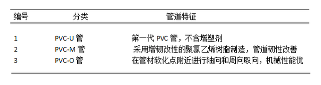 PVC管道以氯乙烯樹脂單位為主,加入必要的添加劑,用擠出成型法制成的熱塑性塑料圓管,具有一定的耐腐蝕性能,一般用于常溫介質的管道。1936年德國開始開發(fā)使用PVC管材,我國從20世紀60年代引入PVC管道,最初主要用于化工領域,輸送帶腐蝕性的流體。根據其性能改進情況,PVC管道分為PVC-U管道、PVC-M、管道PVC-O管道,其各自特點見下表。