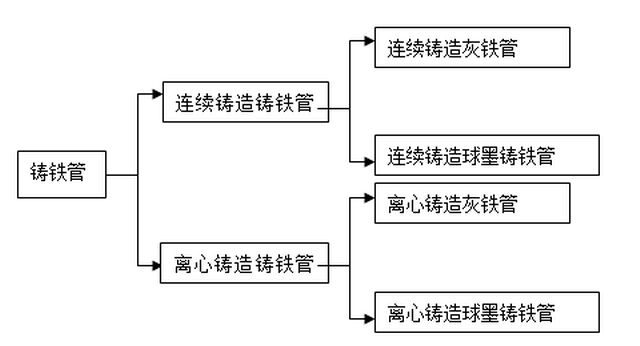 鑄鐵管道是用鐵水燒鑄的圓管的統(tǒng)稱。按管道成型工藝可分為連續(xù)鑄鐵管和離心鑄鐵管,按照鐵水的質量可以分為連續(xù)鑄造灰鐵管、連續(xù)鑄造球墨鑄鐵管、離心鑄造灰鐵管和和離心鑄造球墨鑄鐵管,見下圖